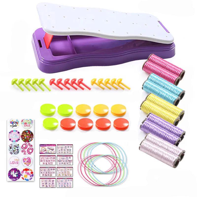 הערכה העשירה להכנת צמידי חברות כוללת מעמד קליעה חדשני ונוח לשימוש, המשמש גם כקופסת אחסון פרקטית לשמירה על כל החלקים מאורגנים.